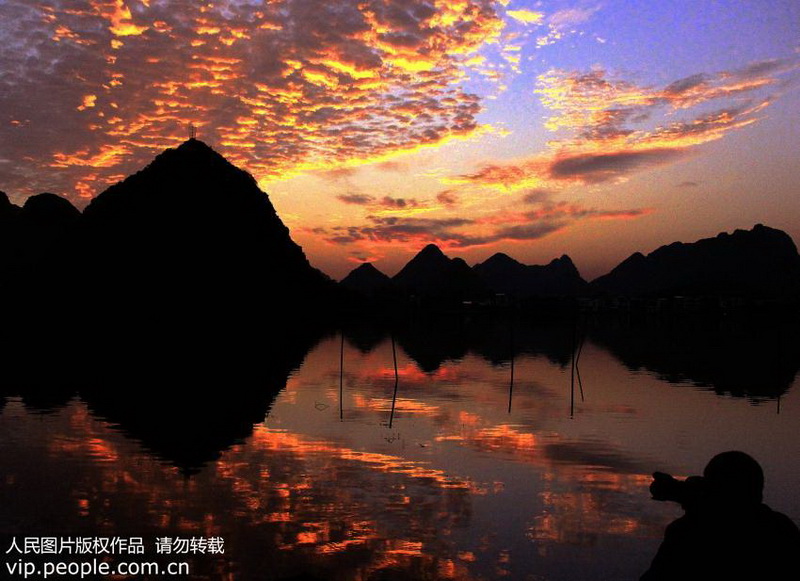 2015年10月14日、広西チワン族自治區(qū)羅城モーラオ族自治県市街地西部の成竜湖公園上空に出現(xiàn)した美しい夕焼け。