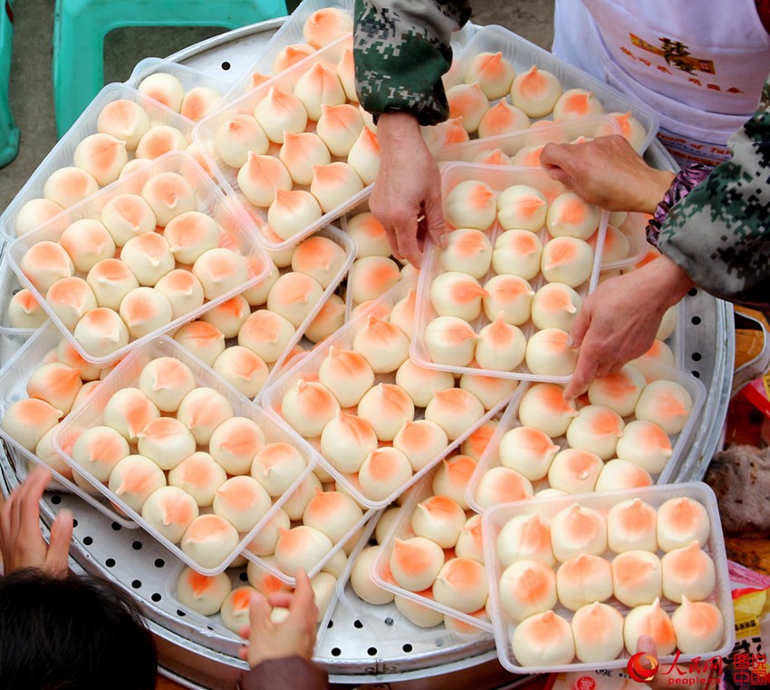 酥肉はすでに切り分け皿に盛る。扇貝粉絲は本來は広東料理だが、グルメな四川の人は既に取り込んでいる。祝いの宴會である以上、桃の形をしたまんじゅうは不可欠だ。特に子供は大好きだ。蒸し料理は時間がかかる。早くから蒸籠で準(zhǔn)備を始める。正午が近づき、炒めものを準(zhǔn)備する。酥肉を蒸籠に入れる準(zhǔn)備。辣子兔丁ができ上がり。肉団子が鍋に入る。チキンフィンガーがすでにでき上がり。開宴を待つ間、孫世代が出し物を披露し始める。蒸籠に入れられる桃の形をしたまんじゅう。日本で漢方薬に使われるジュウヤクの和え物。
