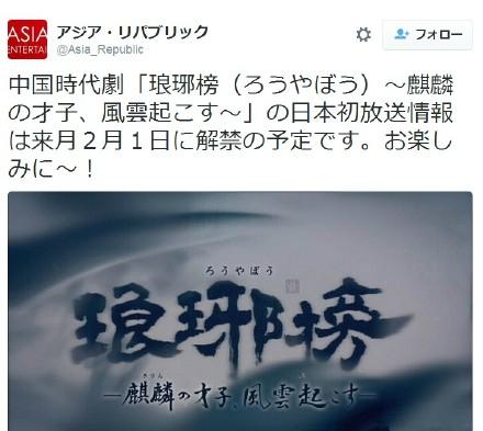 日本のアジア?リパブリック社の情報によると、胡歌( フー?ゴー)、劉濤(リウ?タオ)、王凱(ワン?カイ)、黃維徳(ビクター?ファン)、陳竜(チェン?ロン)らが主演した時代劇「瑯琊榜」を日本で放送する予定だという。日本版は「瑯琊榜(ろうやぼう)~麒麟の才子、風雲(yún)起こす~」の題名で、中國語音聲に日本語字幕をつけ放送する。放送に関する具體的な情報は2月1日に発表されるという。