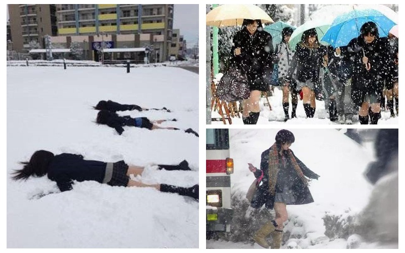 強い暴風雪に襲われても日本の女子高生がミニスカートにルーズソックス姿