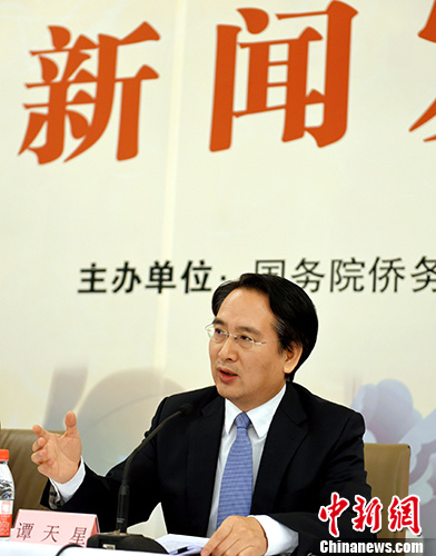 記者會見會場での國務院僑務弁公室の譚天星副室長