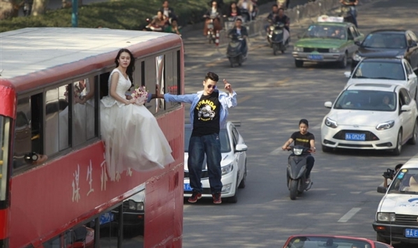 2015年10月、河南省鄭州市で「宙に浮いた結(jié)婚式」のパフォーマンスが行なわれた。走行中の2階建てバスの外側(cè)で、男性が片手を車窓に手をかけ路線バスの片側(cè)に浮いており、ウエディングドレスを著た女性が窓枠のところに腰を掛けている。