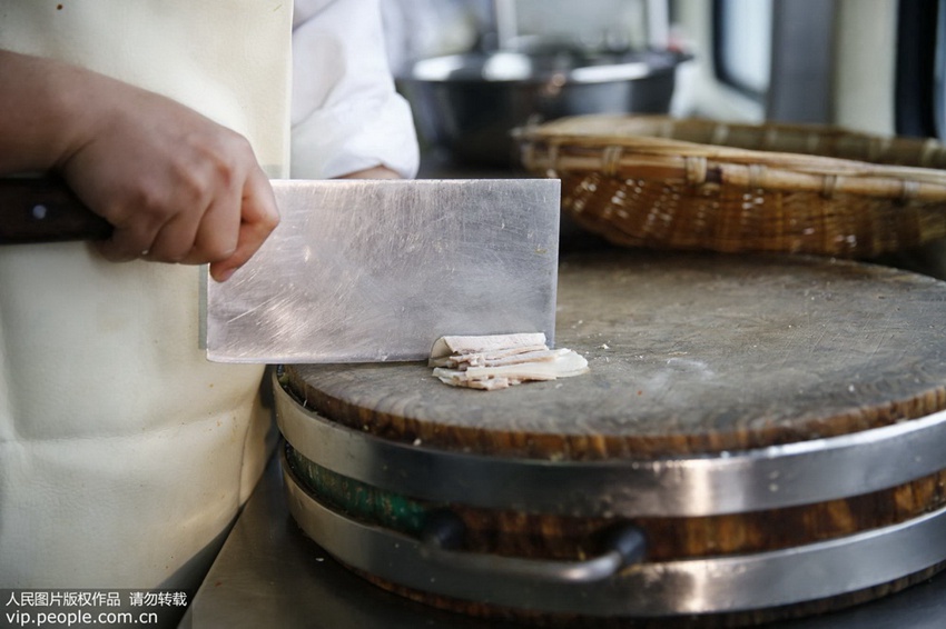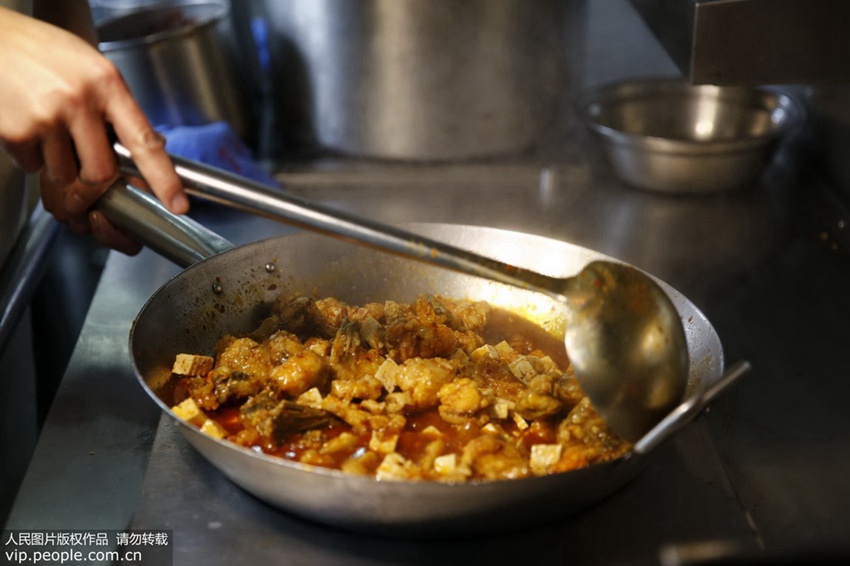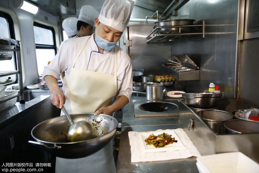 成都と北京西駅を結(jié)ぶZ50號(hào)の列車(chē)で1月27日に提供された晝食は豆瓣魚(yú)、五彩肉丁、番茄炒鶏蛋、蒜蓉青菜の定食料理だった。濃い味とあっさりした味の料理の組み合わせに配慮したほか、肉と野菜をバランスよく組み合わせるよう考慮している。食堂車(chē)で最も人気がある料理は水煮肉片、回鍋肉、魚(yú)香肉絲などの家庭料理だ。辛いのが苦手な乗客には番茄炒鶏蛋や茄溜肉片など辛くない料理を選ぶことができる。