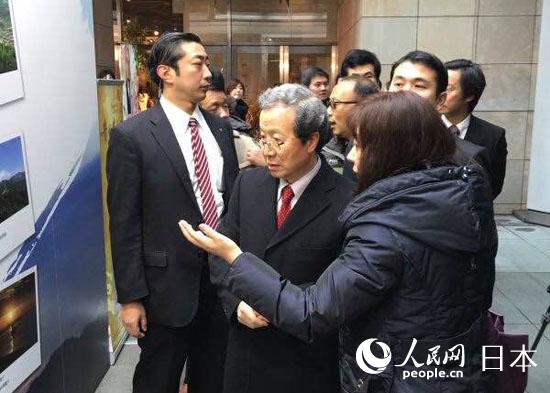 「心に映る中國-訪中日本人観光寫真コンテスト」ブースで人民網(wǎng)のスタッフからの説明を聞く程大使(中央)