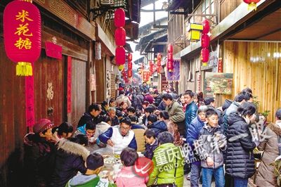 長(zhǎng)さ1132メートルに及ぶ古い町で、家々の軒下に真っ赤な提燈がぶら下がっている。石畳の道で、丸いテーブル600腳が整然に並んでいる。あらかじめ予約しておいたお客は席に著いて待っているのに対して、予約していないお客は一膳の箸を持ち、歩きながら食べたいものを食べることができ、止められることはない。お互いに面識(shí)はないが、色濃い新年の味が味わえる。