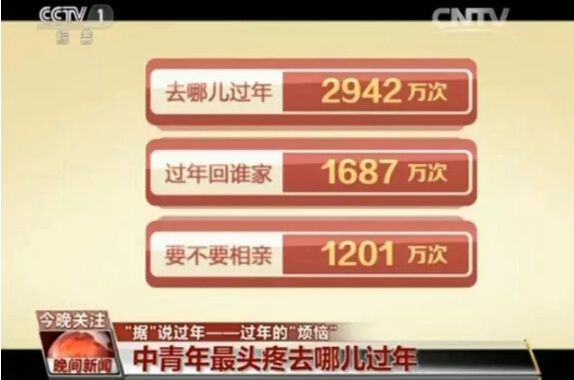 百度検索データによると、舊正月が近づいた1月15日から29日までの半月で「どこで年越しをするか」に関する検索件數(shù)は延べ6千萬件を上回った。話題に上ったトピックス?トップ3は順に、「どこで年越しをするか(延べ2942萬件)」「誰の実家に帰るか(延べ1687萬件)」「お見合いをしなければならないか(延べ1201萬件)」だった。これらの選択に迫られた人々は、21歳から50歳までの中年?青年層に集中した。