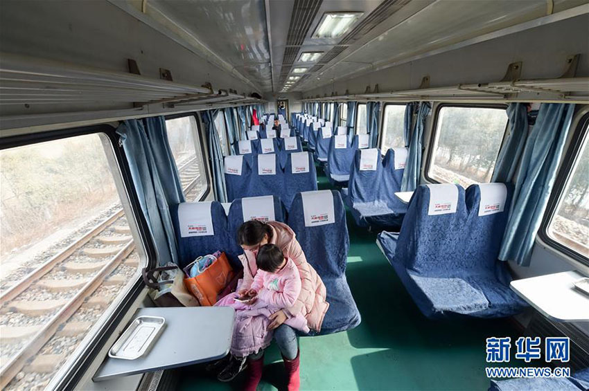 安徽省阜陽発上海行の列車K8365號で2月4日、1人の乗客が子供とスマホで遊んでいる。同日、同列車に乗車したところ、定員數(shù)1175人の列車で硬座(普通席)、軟臥(一等寢臺)の乗客を合わせても403人しかおらず、まるごと空席の車両もあった。阜陽市は大都市に労働力を提供する側で、出稼ぎに行っている労働者が比較的多い。春節(jié)前の阜陽駅は他の都市からの帰省客が主流なので、「逆方向に移動」する乗客は少ない。新華網(wǎng)が伝えた。(編集JK)