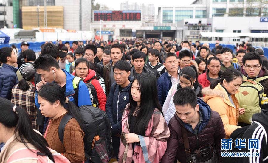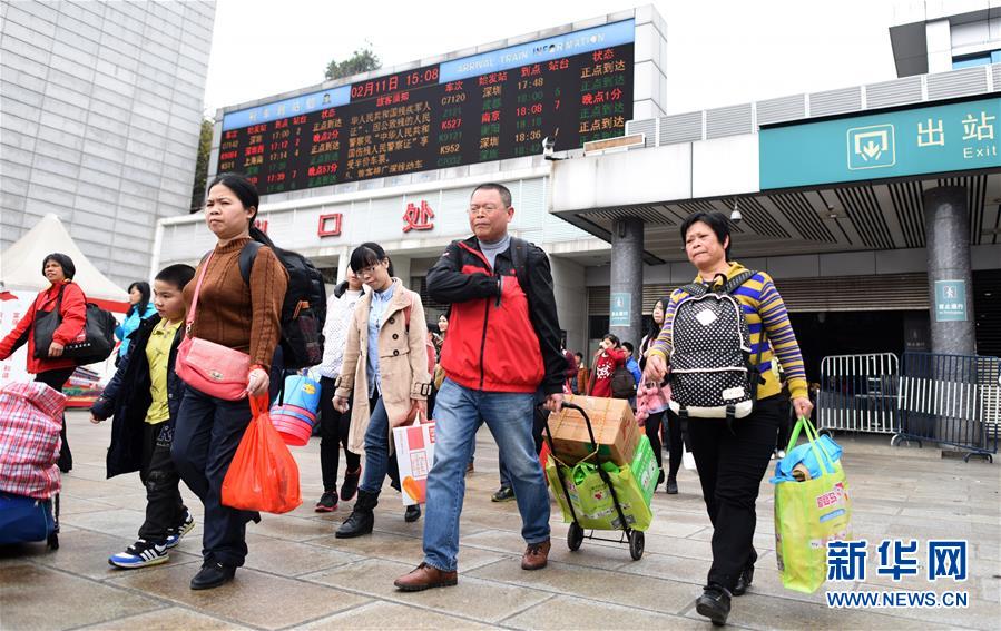 2月11日に広州駅を出る乗客。舊正月4日にあたる同日、中國(guó)鉄道総公司によると、全國(guó)の鉄道発送客數(shù)は延べ769萬人、旅客列車346本を増便し、うち複數(shù)の鉄道局に跨る中長(zhǎng)距離旅客列車は117本、鉄道局內(nèi)の旅客列車は229本だ。新華網(wǎng)が伝えた。(編集NA)