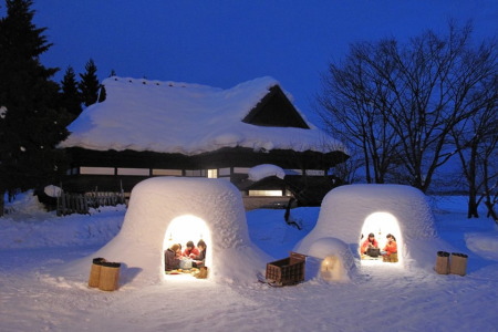 バレンタインデーに因んでハート形に作られたかまくらがピンク色のライトアップに映え、大勢(shì)のカップルが寫(xiě)真を撮りに集まっていた。かまくらの中に座る地元の子供たちがこの地方の方言で「あがってたんせ」と客を呼んでいる?!袱ⅳ盲皮郡螭弧工趣稀钢肖松悉盲皮坤丹?、召し上がってください」という意味で、甘酒や餅で観光客をもてなす。