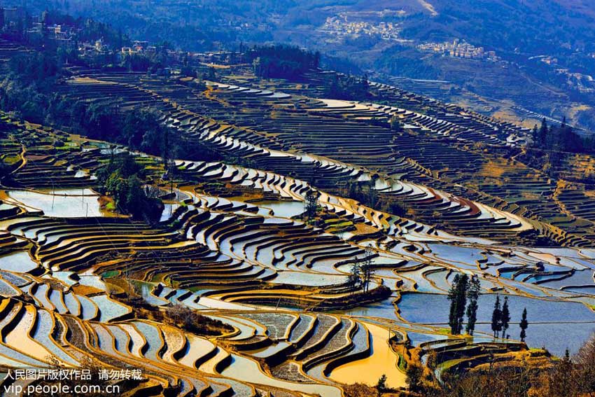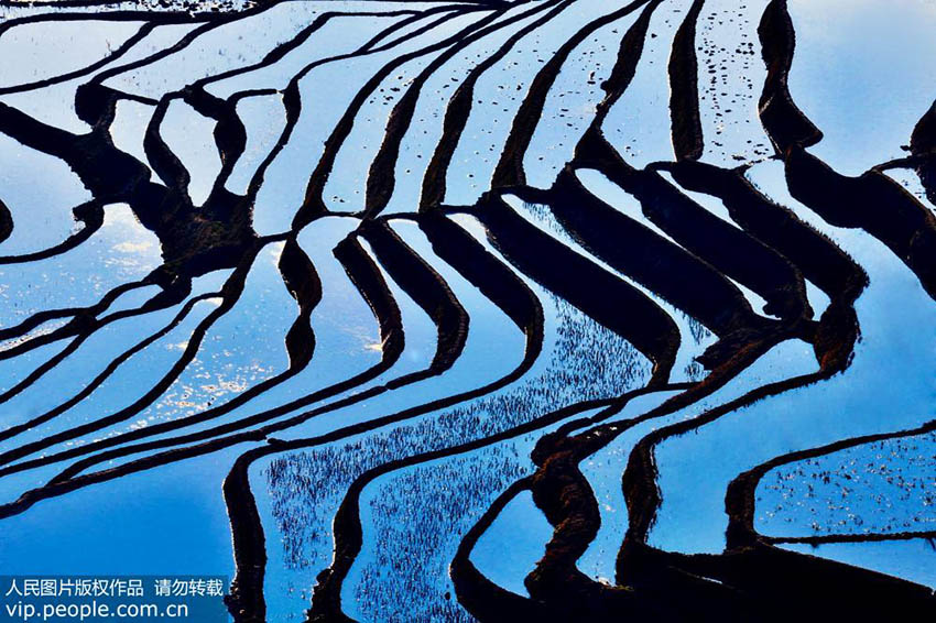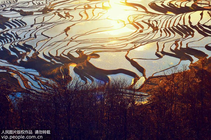 雲(yún)南省元陽県哀牢山南部に位置する棚田は中國にとって45番目の世界遺産であり、ハニ族が1300年余りの間、先祖代々受け継いできた「彫刻」の傑作である。同県のハ二族が開墾した棚田は、山肌の地形に沿って作られ、規(guī)模が大きく迫力があることから、「地球上で最も美しい曲線」と稱されている。寫真は2月20日、雲(yún)南省紅河ハニ族イ族自治州元陽県で撮影した美しい棚田の景色である。(編集JK)