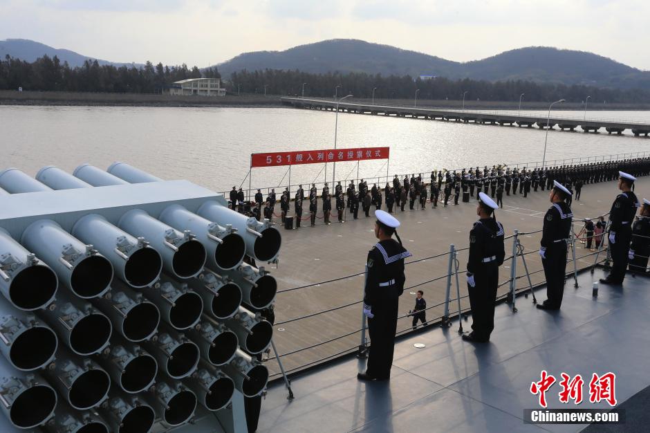王華勇?東部戦區(qū)副政治委員兼東部戦區(qū)海軍政治委員が軍旗と命名証書を授與した?!赶嫣丁工现袊灾鏖_発した次世代ミサイル護衛(wèi)艦であり、長さ140メートル、幅16メートル、満載排水量は4000トン余り。単獨または海軍の他の兵力と共に敵の水上艦や潛水艦を攻撃でき、高い遠距離警戒?対空作戦能力を備え、中國海軍にとって次世代の主力作戦艦だ。(編集NA)