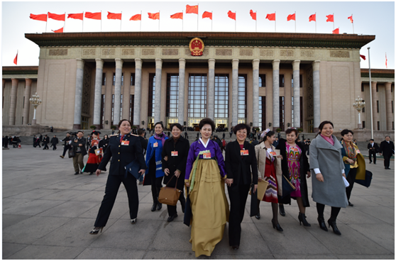 笑顔で人民大會(huì)堂から出た女性代表ら