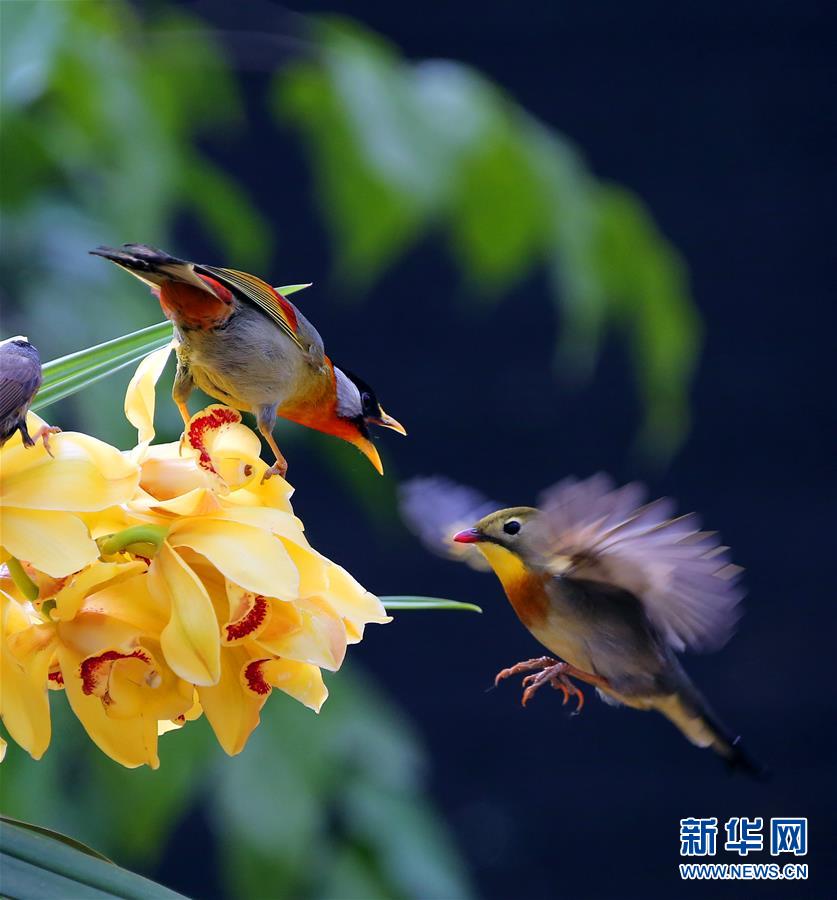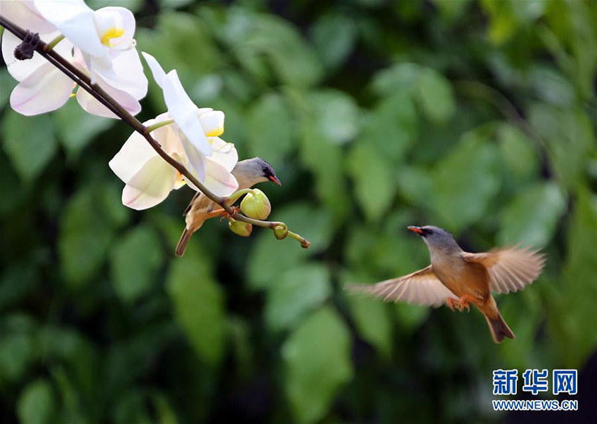 北京市房山區(qū)韓村河の観光パークで2月25日、數(shù)羽の小鳥が溫室內(nèi)で楽し気に遊んでいる。(編集JK)