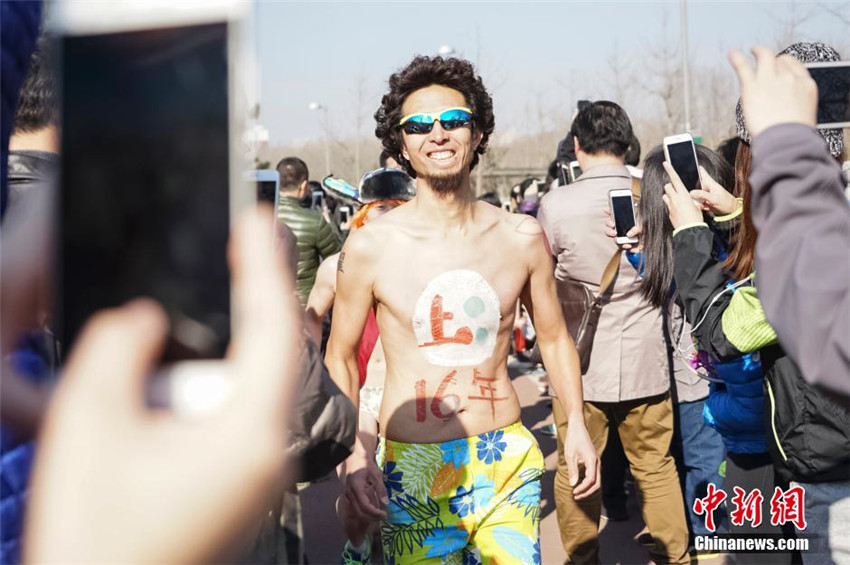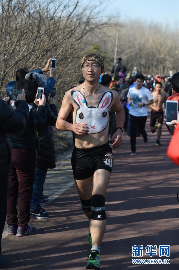 マラソン愛好家が北京市のオリンピック森林公園で2月28日、上著を脫ぎ去り「裸ランニング」に參加した。裸ランニングとは參加者が下著のみでランニングする大會のことだ。中國新聞網(wǎng)が伝えた(編集JK)