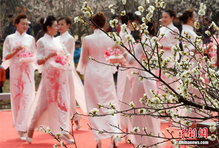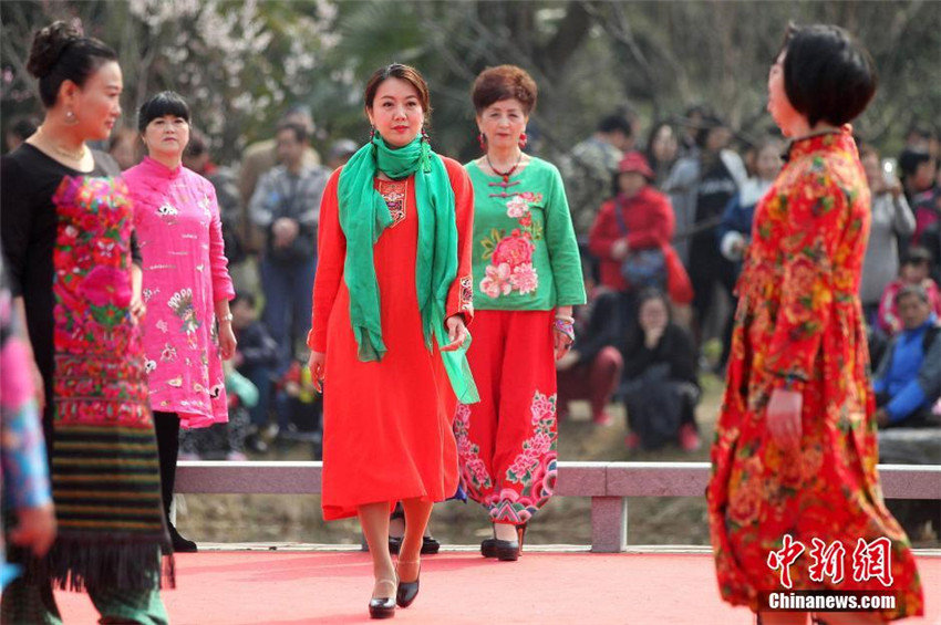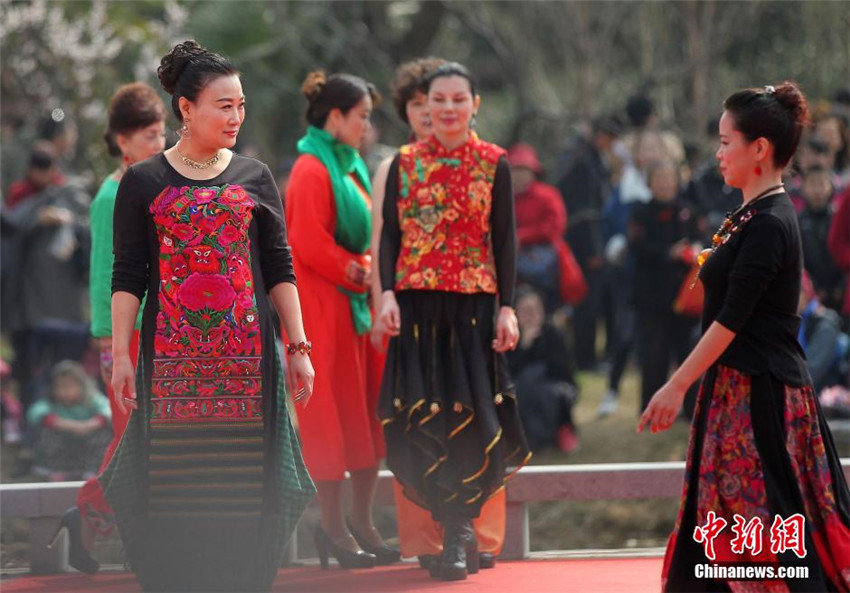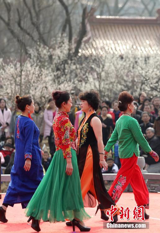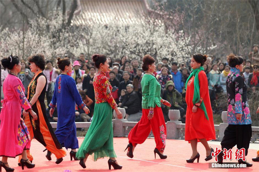 「梅の花」がテーマの中國服のファッションショーが2月28日、江蘇省南京市明孝陵梅花山広場で行われた。コミュニティから集まった中高年層のモデルたちがショーの舞臺にあがり、颯爽たるモデルの姿を発揮しており、満開に咲き誇る梅林の梅の花と美を競い合っていた。中國新聞網が伝えた。(編集JK)