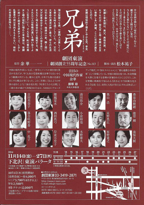 そんな『兄弟』は昨年、 日本で舞臺になった。創(chuàng)立から50年以上の歴史を持つ劇団?東演が舞臺化し、二週間にわたって下北沢の客席約70人の劇場で公演をしたのである。もちろんわたしも観に行ったが、自分の翻訳したセリフを俳優(yōu)さんたちが口にしてくれことも感動ながら、中國の大河ドラマともいえる四十年間に及ぶ『兄弟』の物語が日本で舞臺になったことに、なんともいえぬ深い感慨を覚えた。わたしの斜め後ろに座っていた大學生らしき若い女性は、幕が下りた時には號泣していた。原作(わたしが翻訳した本)は読んでいないというから、純粋に舞臺を見て、涙が抑えられないほどに感動したのである。中國語の小説が日本語になり、それが日本語の舞臺になり、それを見た観客の涙を誘う。自分の翻訳がそこに介在していることに、翻訳者として、これまでには體験したことのない新たな感動、喜びを感じた瞬間であった。インターネットなどを見ると、舞臺化が話題になり、あらためて本を読みなおしてくれた読者もいたようである。この舞臺は『朝日新聞』の劇評などにも好評され、千秋楽までほぼ連日満員の大盛況であった。中國のことに詳しいとは言えない俳優(yōu)さんたちが、実にいい味を出して中國人の登場人物を演じていたのはもちろん、腳本、演出の力も大きい。あれだけの長編を1時間45分という時間の中に見事に収め、その世界のなかにとりこんで感動させる腳本、演出家の力には脫帽である。余華本人も伝えたが、彼に見てもらえないのがとにかく殘念でならなかった。