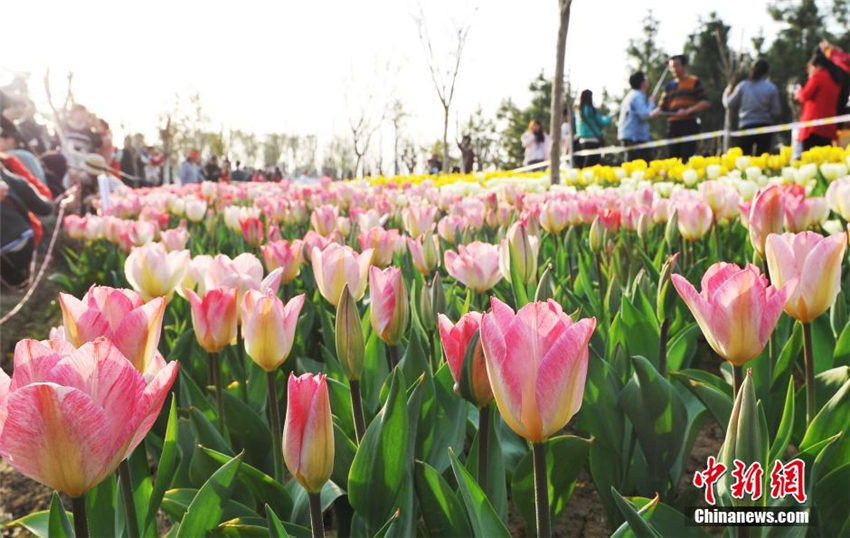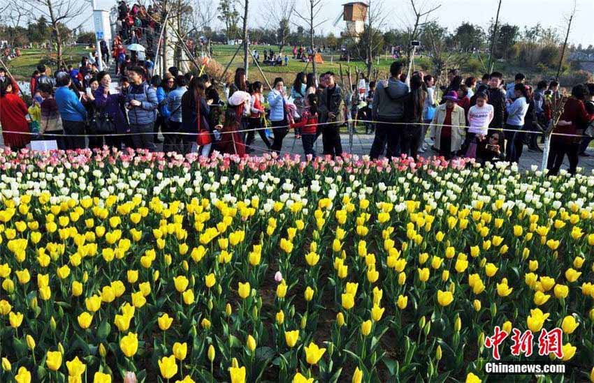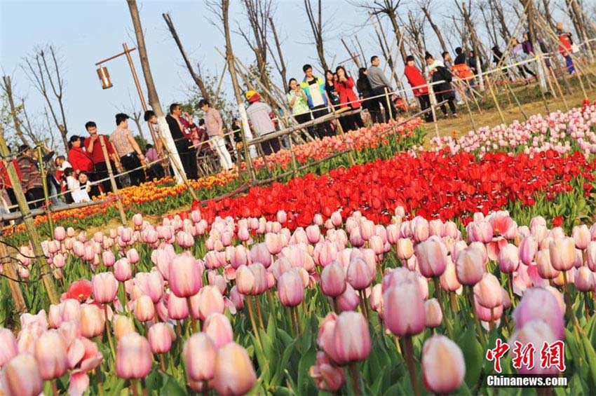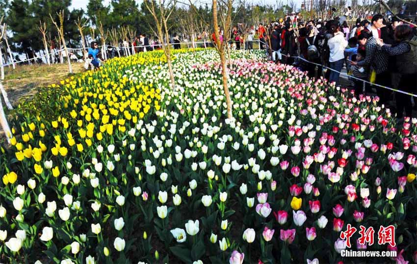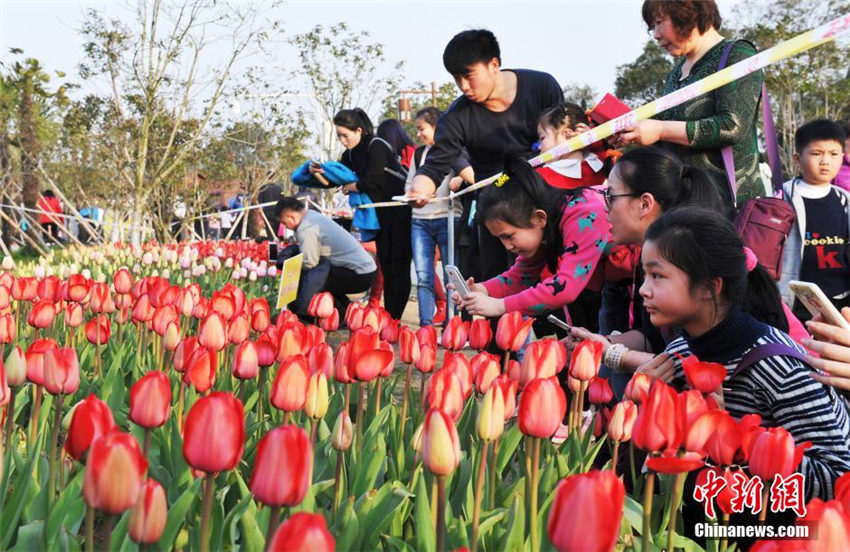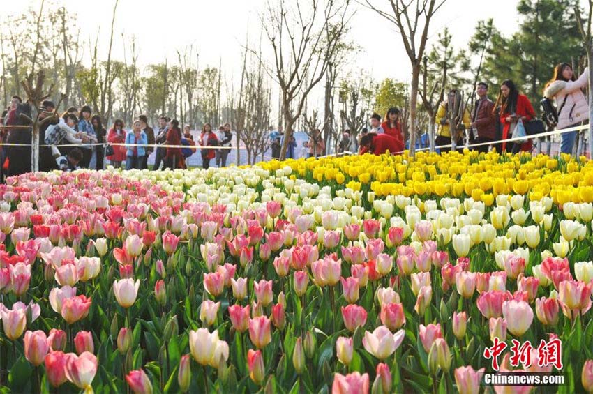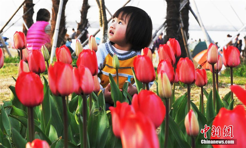 江西省南昌市にある瑤湖郊野森林公園のチューリップが2月28日、次々に開花し、大勢の市民や観光客でにぎわっている。同日、晴天に恵まれた南昌市は週末とも重なり、公園を訪れる観光客は激増した。同公園にはオランダから輸入したチューリップ100萬株が赤、ピンク、黃色、白など色とりどりに咲き亂れ、大勢の観光客や寫真愛好家が記念撮影を行なっていた。中國新聞網(wǎng)が伝えた。(編集JK)