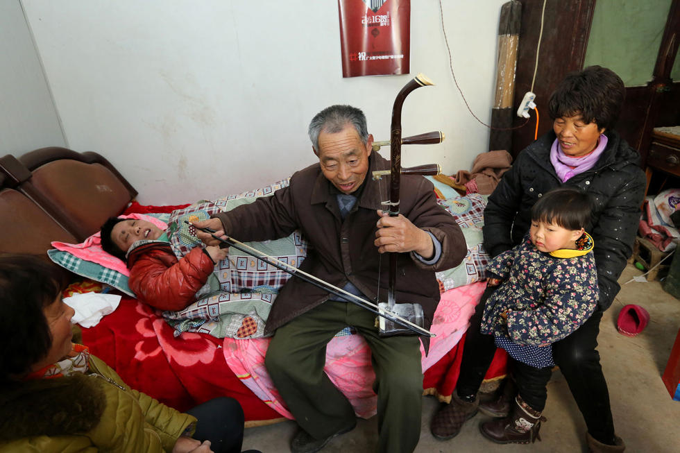 河南省洛陽市にある伊浜區(qū)佃莊鎮(zhèn)黃莊村の黃鎖さん(70)の家の中で2月29日、彼が妻のベッドそばに座り「北京の金山の上で」を弾き始めると、妻の見舞いに訪れた隣近所の人たちは彼の演奏に聴き入っていた。25年前、彼の妻は身體がマヒする病を患い寢たきりになった。彼は毎日、寢たきりの妻のために二胡を弾き気晴らしをしてきた。25年の間で、2、3回ほど二胡を交換し、200曲以上の曲が弾けるようになった。中國放送網(wǎng)が伝えた。