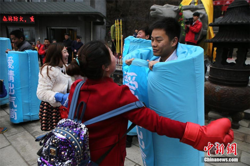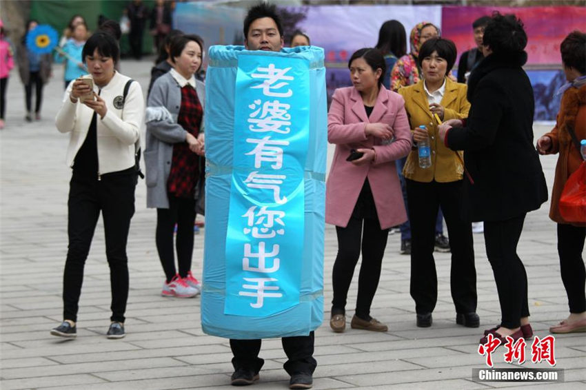 3月8日の國(guó)際女性デーを控えた3月6日、河南省の老君山にある天門(mén)広場(chǎng)で男性數(shù)名が「妻よ、腹が立つならパンチを」と書(shū)かれた「愛(ài)のサンドバッグ」を身にまとい、それぞれ自分の妻の前に立っている。彼らは自ら進(jìn)んで妻の八つ當(dāng)たりの対象となるべくサンドバッグに徹している。夫たちは日々の生活で良くない部分がたくさんあり、妻に多くの借りを作っていると感じているため、自分たちにパンチすることでうっぷんを晴らしてもらい「罪滅ぼし」をしている。中國(guó)新聞網(wǎng)が伝えた。(編集JK)