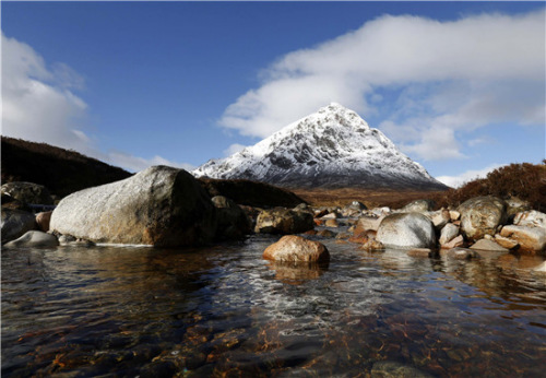 英スコットランド地方バラチェリッシュ付近。高山では、山頂の雪はまだ解けていないが、 山麓では雪解け水がさらさらと流れている。