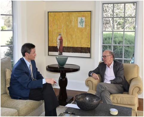 人民日報の取材を受けるスティーブン?ローチ氏(右)(撮影 辺紅)