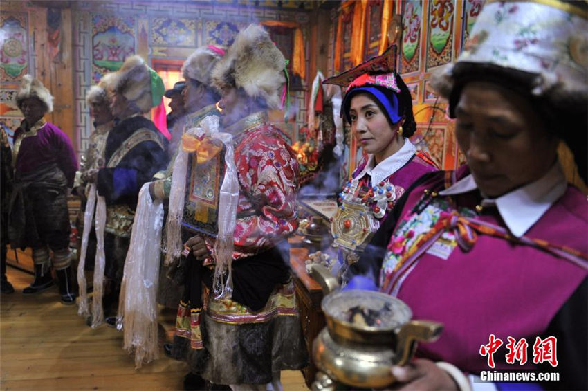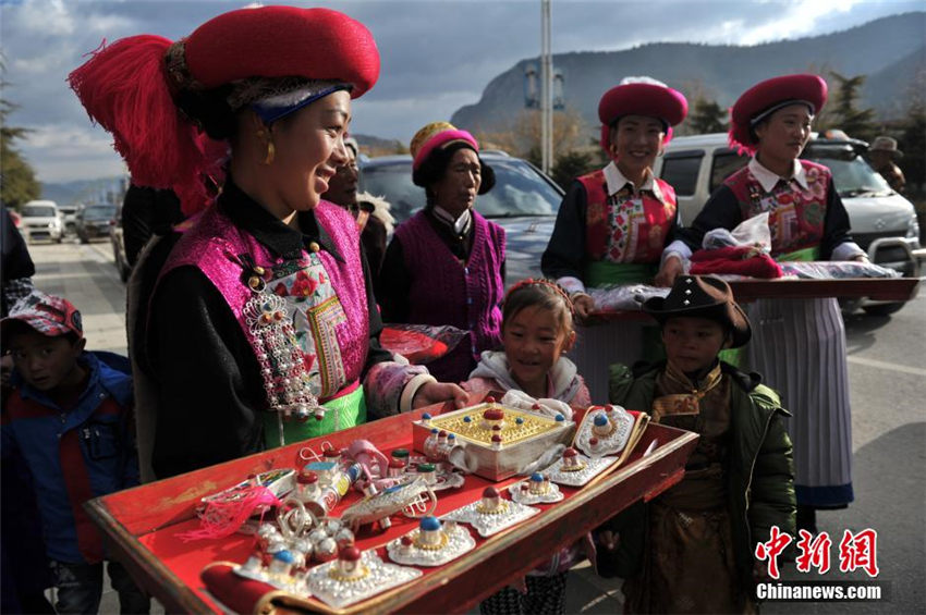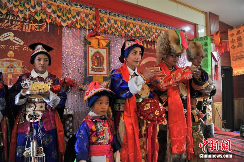 チベット族の若者斯諾羅傑さん(29)が3月13日、自身の故郷である雲(yún)南省デチェン?チベット族自治州シャングリラ市で伝統(tǒng)的なチベット族の結(jié)婚式を執(zhí)り行った。同日午前7時過ぎ、彼の花婿介添団たちが新婦を迎に行くためシャングリラ市建塘鎮(zhèn)林都村へ出発した。新婦の桑傑卓瑪さん一家が伝統(tǒng)的なチベットの歌を歌う中、新婦は正式に新郎の家に嫁ぐこととなった。中國新聞網(wǎng)が伝えた。(編集JK)