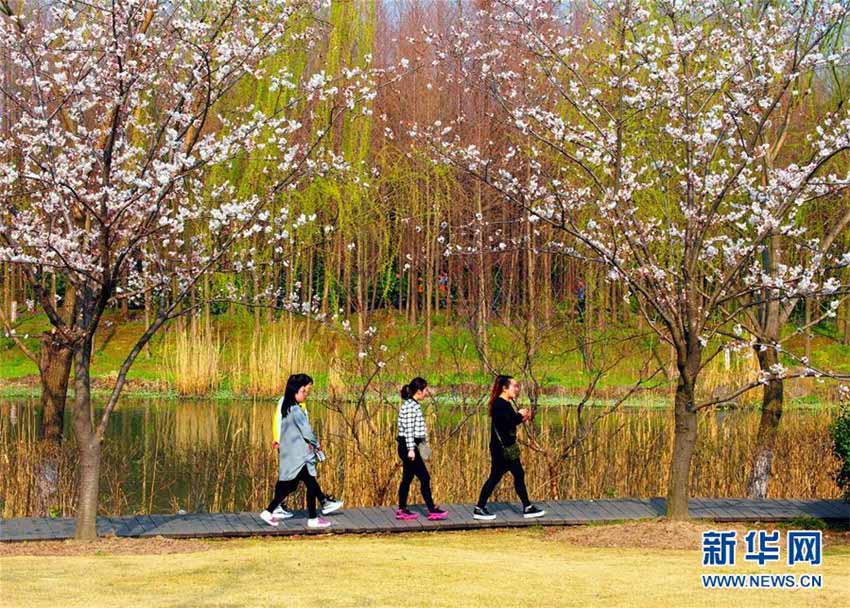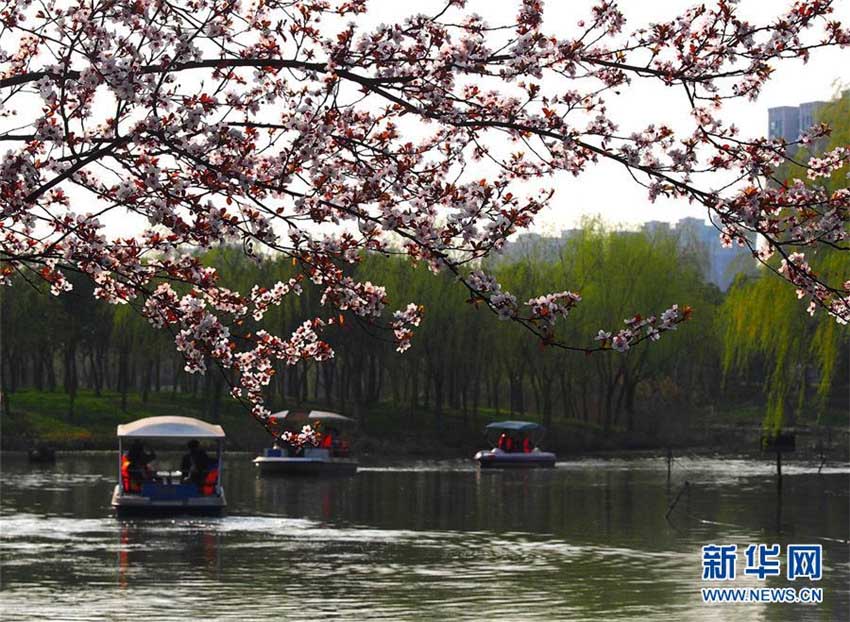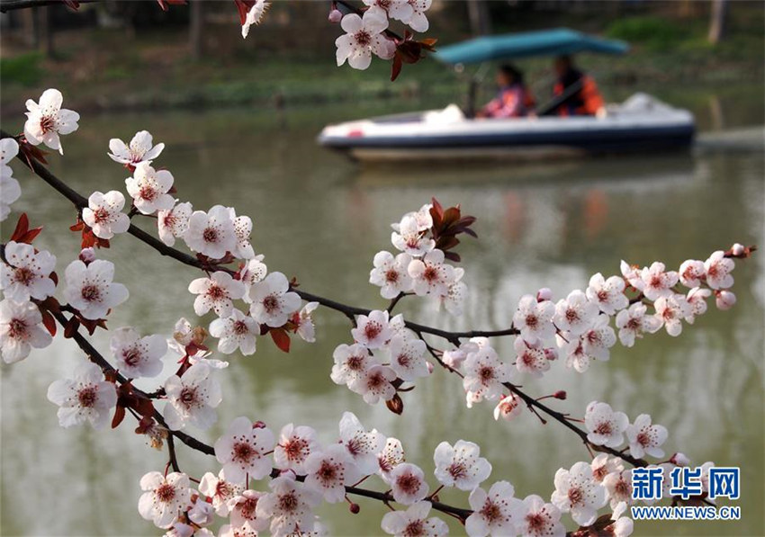 上海市の顧村公園で3月16日、観光客が舟に乗りながら桜を鑑賞している。年に一度の上海桜まつりは3月18日に開幕し、4月15日まで開催される予定だ。新華網(wǎng)が伝えた。(編集JK)
