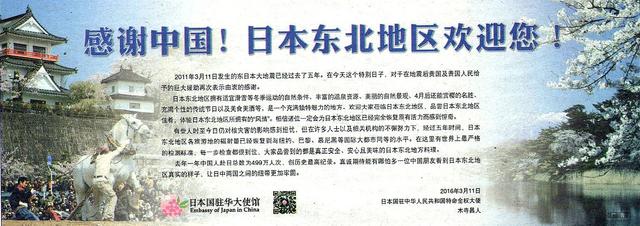 そして震災(zāi)後5周年を迎えた今年の3月11日、中國の新聞「環(huán)球時報」に在中國日本大使館と木寺昌人駐中國大使の名で「ありがとう中國!日本の東北地方はご訪日を歓迎いたします!」と題した広告が掲載された。このほど人民網(wǎng)は在中國日本大使館にこの広告掲載の件に関する取材を行った。人民網(wǎng)が伝えた。