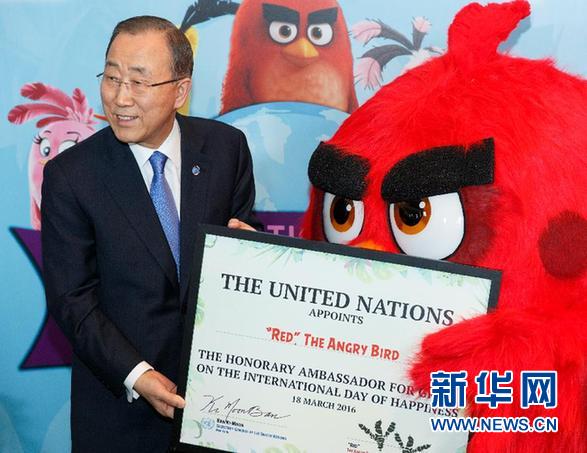 任命イベント會(huì)場(chǎng)では同日、アングリーバードが國(guó)連本部ビルに現(xiàn)れ、その可愛(ài)い姿に潘基文國(guó)連事務(wù)総長(zhǎng)を含む會(huì)場(chǎng)の人々が集まり、記念寫真を撮影していた。潘國(guó)連事務(wù)総長(zhǎng)は、「このキャラクターイメージ大使は人々が人類の共通の未來(lái)のための気候行動(dòng)の重要性をより理解することを支援している」と話す。