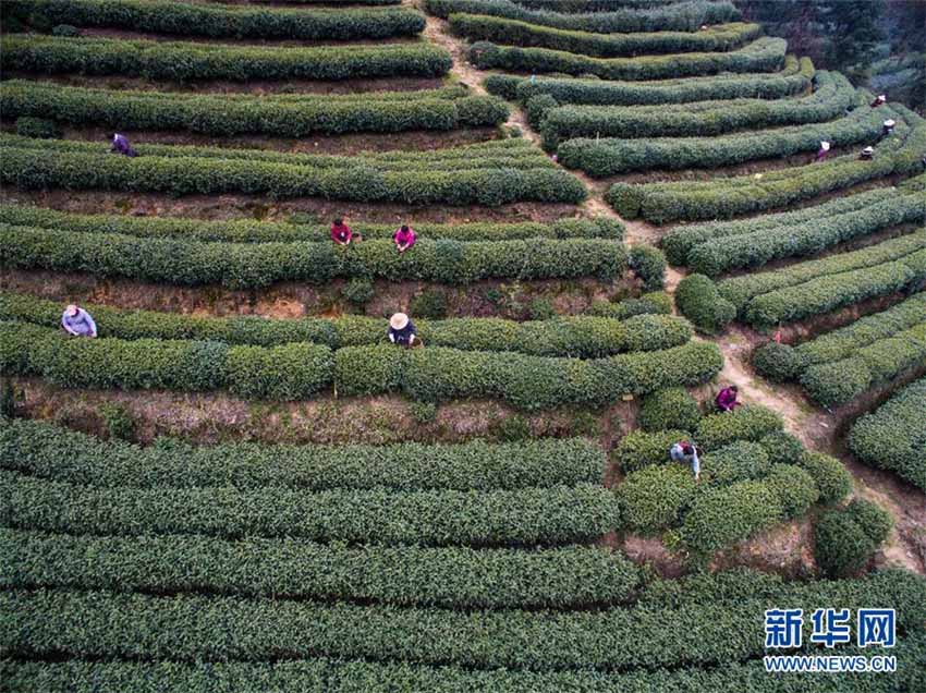 浙江省杭州市茶摘み職人が梅家塢村の茶畑で3月21日、西湖竜井茶の2016年度の一番茶を摘んでいる。ベテランの茶摘み職人が1日かけて摘んだ青い葉を煎ると、およそ500グラムの竜井茶が出來上がる。新華網(wǎng)が伝えた。