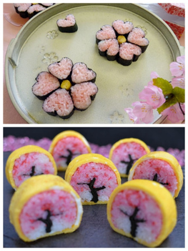 【桜壽司】一般的にこの壽司は桜が満開になる季節(jié)限定とされる。ピンク色の壽司と美しい花びらが織りなすハーモニーが極めて美しい。壽司の種類は主に桜の巻き壽司、マグロや卵を使った飾り壽司などがある。