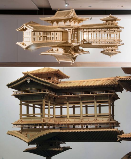 日本の蕓術(shù)家?guī)r崎貴宏氏は細(xì)く切った柏の木とワイヤーで寺院の彫刻作品シリーズを製作した。宙に浮く古代寺院の模型は鏡を合わせたように複製されており、建築物と逆さまの建築物の間には見(jiàn)えない鏡が存在するように見(jiàn)える。(編集JK)
