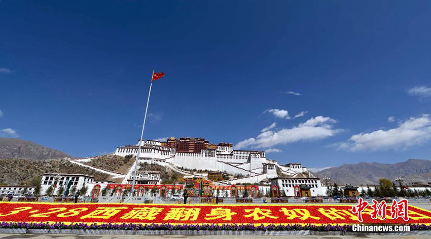 西蔵(チベット)自治區(qū)ラサ市のポタラ宮広場(chǎng)で3月27日、巨大なスローガンが掲げられ、同自治區(qū)は100萬(wàn)人の農(nóng)奴解放57周年の記念日を迎えた。中國(guó)新聞網(wǎng)が伝えた。(編集JK)