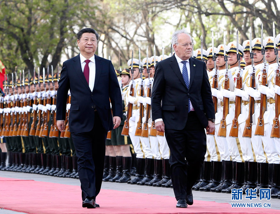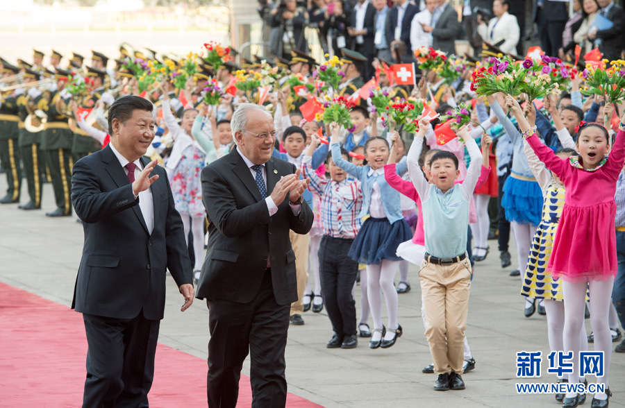 習(xí)主席は、「雙方は中國(guó)が実施する革新による駆動(dòng)の戦略とスイスの革新における優(yōu)位性とを結(jié)びつけ、両國(guó)が革新協(xié)力プラットフォームの構(gòu)築を支援し、企業(yè)、大學(xué)、科學(xué)研究機(jī)関の間での革新をめぐる?yún)f(xié)力を展開(kāi)し、再生可能資源、現(xiàn)代型エコ農(nóng)業(yè)、省エネ?環(huán)境保護(hù)、醫(yī)薬などの分野での互恵協(xié)力を深化させなければならない?!阂粠∫宦贰唬?ベルト、1ロード)の共同建設(shè)は中國(guó)?スイスの協(xié)力のためにより幅広い可能性を切り開(kāi)いており、中國(guó)もスイスとともにアジアインフラ投資銀行(AIIB)の枠組內(nèi)での協(xié)力を強(qiáng)化したいと考えている」と述べた。