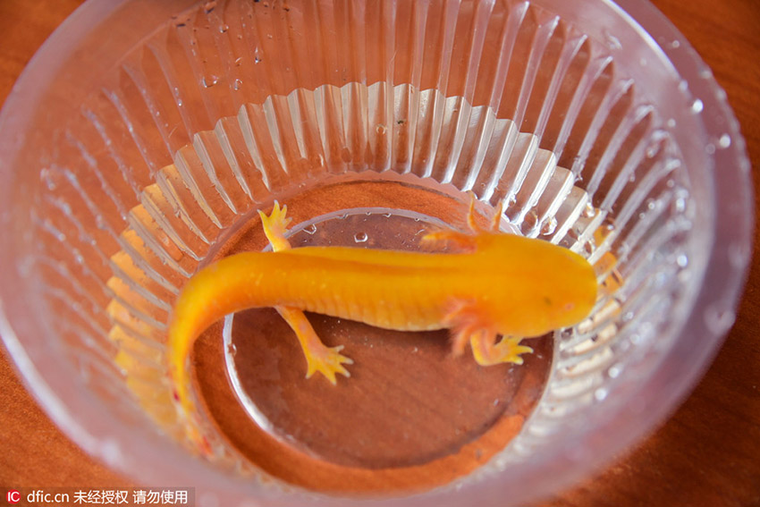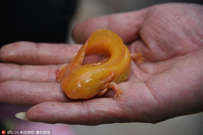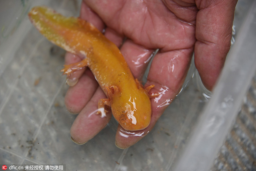 この動物は一體何なのだろう?鄭州市林業(yè)局野生動物救護(hù)所の董朝偉所長は、「外見からすると確実にオオサンショウウオ屬に似ているので、いわゆるオオサンショウウオだろう。しかしオオサンショウウオの身體の色はこんな色ではない。ネットの報道から見ると、オオサンショウウオの突然変異だとする人や黃金のサンショウウオという人もいるが、私は後者のほうだと思う。しかし、それが一體何なのかを確定するには魚類、両生類専門家に鑑定しもらうのが一番いい」とストレートに語った。