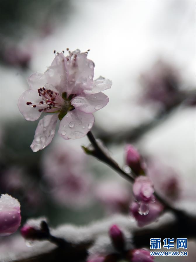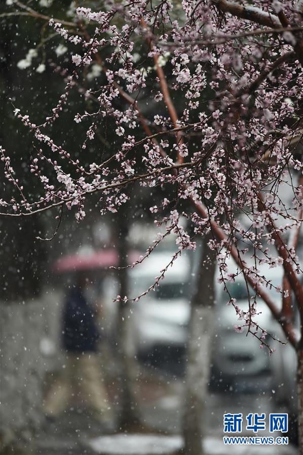 寫真は12日、吉林省長春市の東中華通りで撮影された雪の花と桃の花。この日、寒気の影響で同市は広い範囲でみぞれが確認され、同市の市街地では雪と桃の花が同時に現(xiàn)れる特別な光景が見られた。新華網(wǎng)が伝えた。(編集MI)