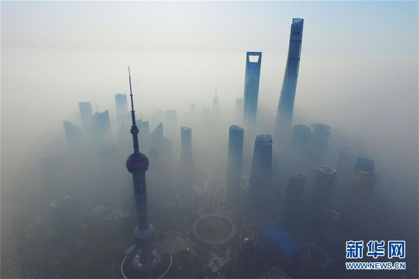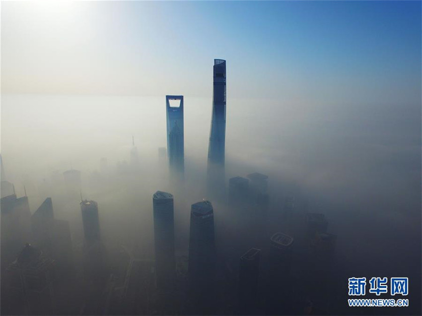 上海市浦東エリアの陸家嘴にある高層ビル群を4月14日空撮した。同日、13日から濃い霧が発生し始めた影響で、上海の視程が悪くなったことで霧の合間を見え隠れする陸家嘴の高層ビル。新華網(wǎng)が伝えた。(編集JK)