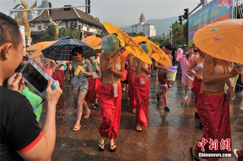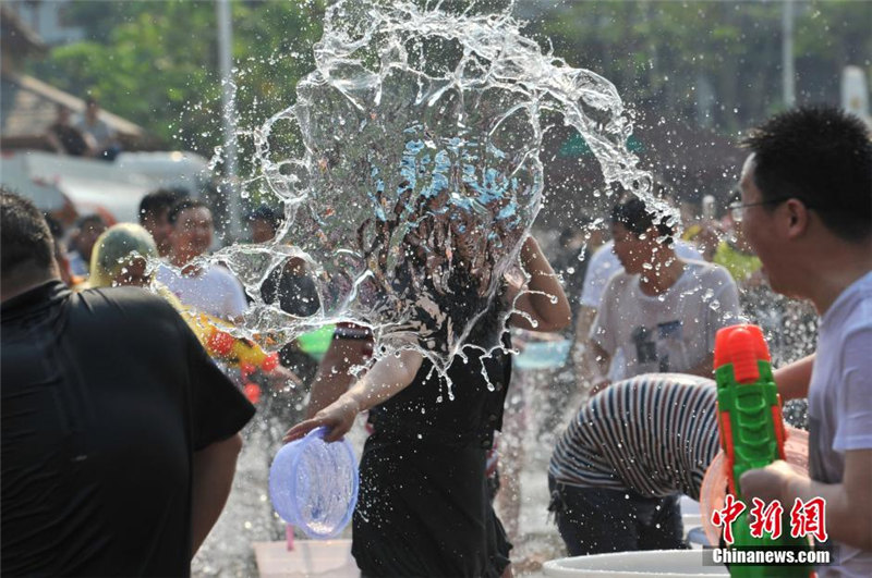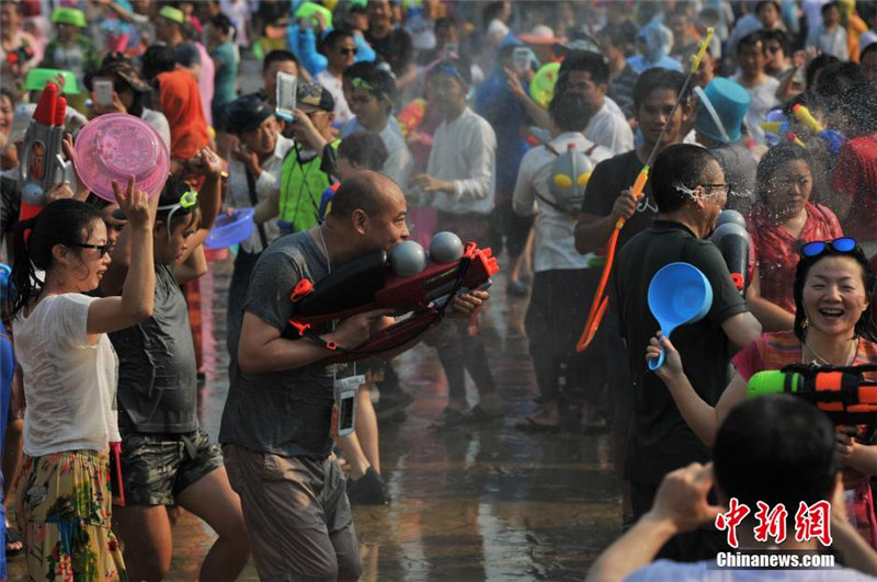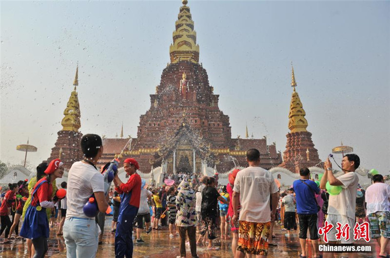 雲(yún)南省西雙版納(シーサンパンナ)州告莊西雙景で15日、観光客と現(xiàn)地のタイ族の人々1萬(wàn)人あまりが共に水をかけ合い、タイ族暦1378年の新年を祝った。この「水かけ祭」は「浴仏節(jié)」とも呼ばれるタイ族の新年の祭で、シーサンパンナで最も盛大に祝われる伝統(tǒng)的な祝日の一つ?!父媲f西雙景」は現(xiàn)地の言葉で「9つの塔、12の集落」という意味だ。中國(guó)新聞社が伝えた。(編集SN)
