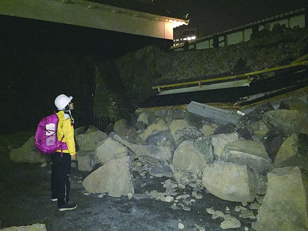 17日夜、震災(zāi)後の熊本城を訪れた中國(guó)記者