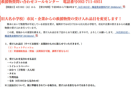 救援物資を募集する福岡市の公式サイト。熊本市で不足している物資は、ウェットティッシュや常溫?長期保存が可能な栄養(yǎng)補(bǔ)助食品。ペットボトルの水やトイレットペーパー、おむつ、タオルなどは受け入れを見合わせる品目になっている。