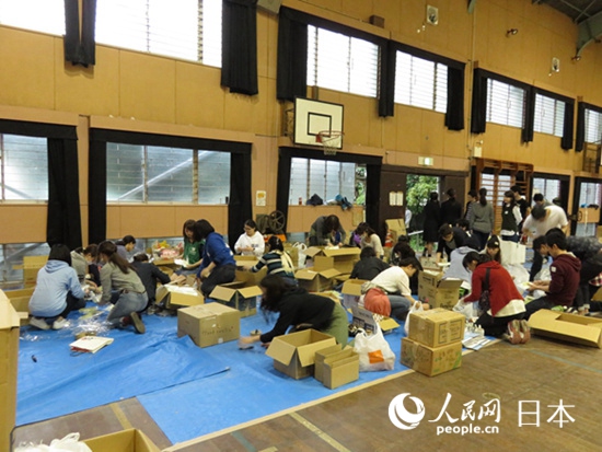 學校體育館で物資を分類するボランティア