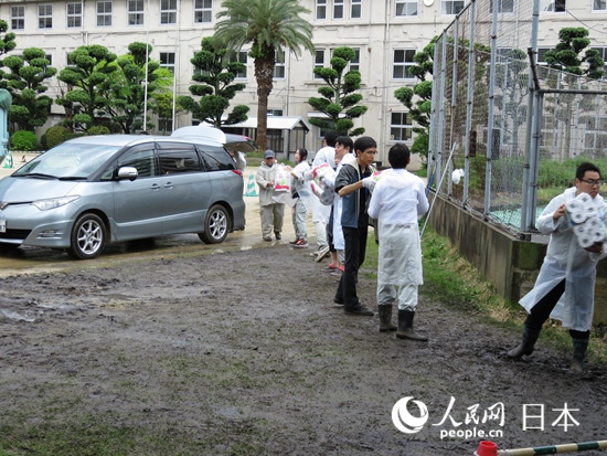 學(xué)校グラウンドで雨の中救援物資を受け付けるボランティア