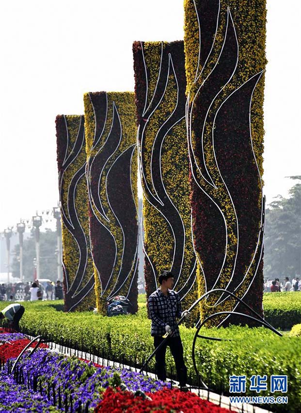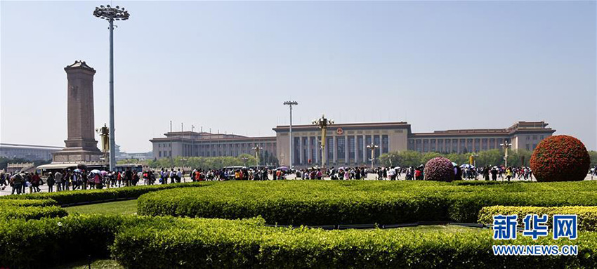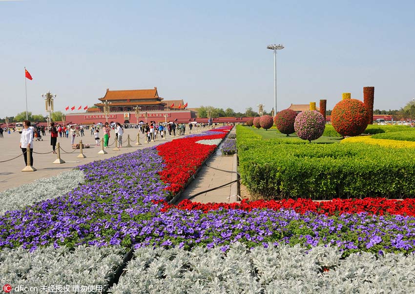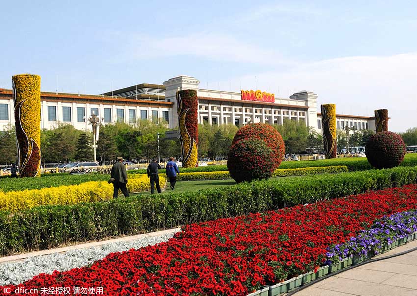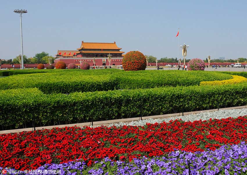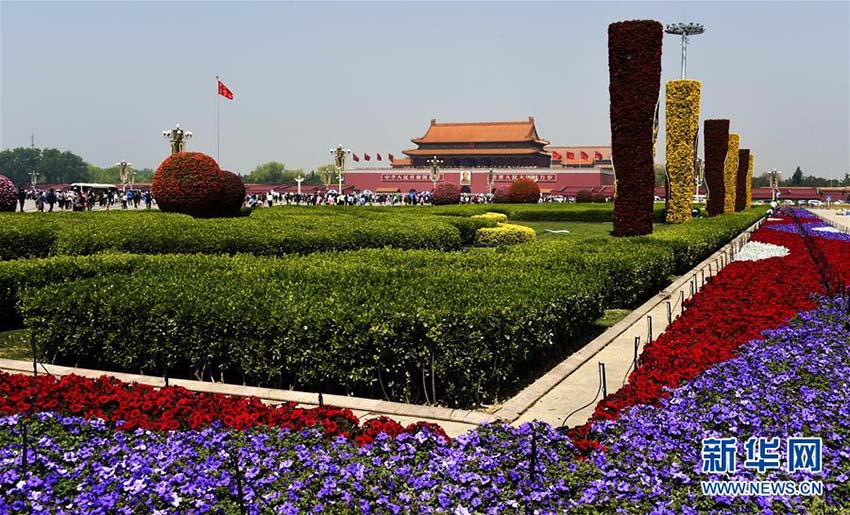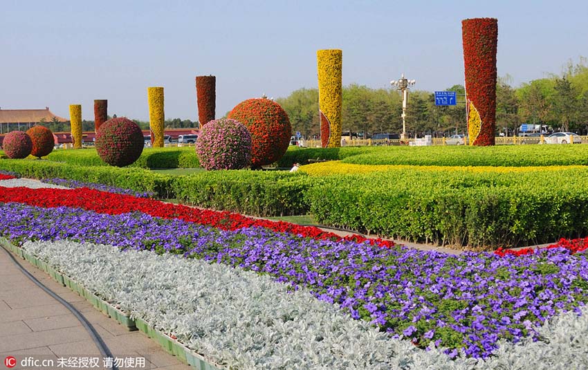 2016年のメーデーを間近に控え、市民や観光客らに楽しんでもらおうと、北京市園林當局は天安門広場の東西両サイドに巨大なフラワーオブジェや生花、鉢植えのアートを設(shè)置している。(編集JK)