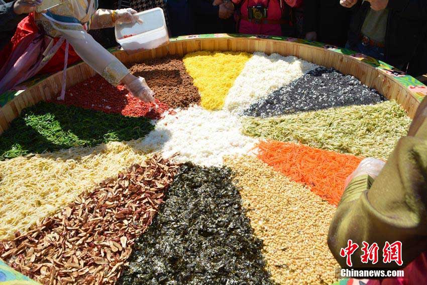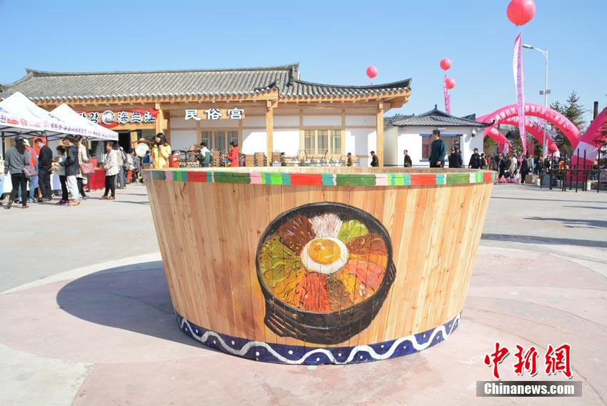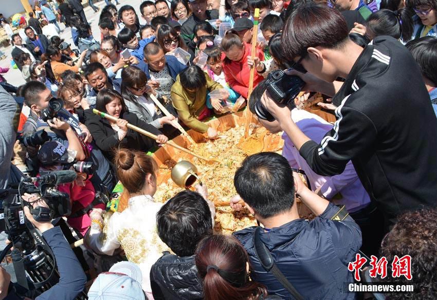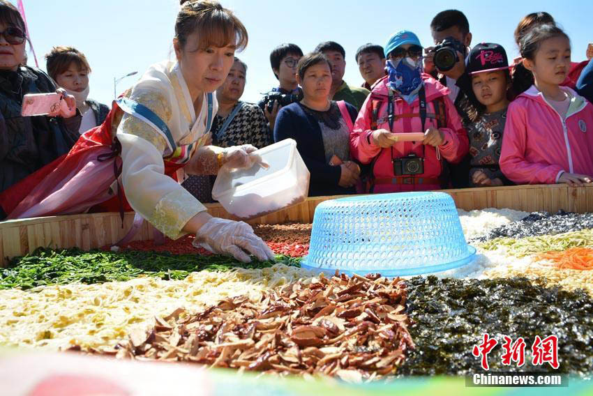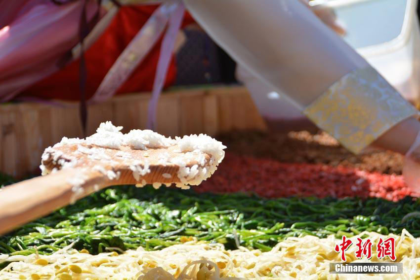 吉林省延辺朝鮮族自治州和竜市金達(dá)萊村の金達(dá)萊亭広場の真ん中で4月24日、高さ1メートル、直徑2メートルの飯桶いっぱいに作られた朝鮮族の名物料理「ビビンバ」に大勢の観光客が群がっている。このビピンバは4種類の米とひき肉、クコ、もやし、卵、松の実、ほうれん草、桔梗、ニンジン、海藻などの材料で作られており、総重量は150キロにもなるという。しっかりかき混ぜ、でき上がると10分で観光客らに配り終えた。この日に開幕した第8回長白山金達(dá)萊國際文化観光祭は4月30日まで行われる予定だ。中國新聞網(wǎng)が伝えた。(編集JK)