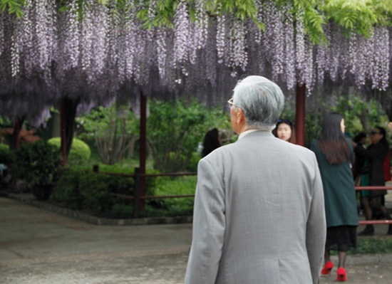 4月20日午前、嘉定紫藤園の藤棚の下には人々があふれ、靜かに鑑賞したり、待ちかねたようにカメラを取り出し目の前に広がる絶景をカメラに収めていた。あたりにはほんのりと藤の花の香りがただよい、人々を魅了していた。その人ごみの中にただ一人やや場違いなほどきっちりとしたスーツを著こなした白髪の紳士がいた。足元はややふらついているものの、背筋はすっと伸びたその紳士はまるで自分の子供を見るようなまなざしで藤の花をじっと眺めていた。彼の名は藤本道生さん、30年もの間、中日友好事業(yè)に力を注ぎ続けている人物で、この紫藤園こそが彼の努力の結(jié)晶だ。