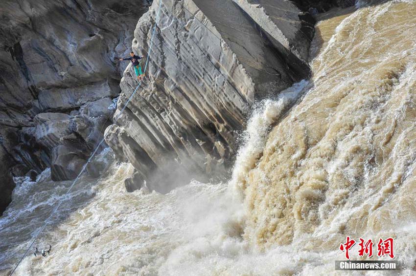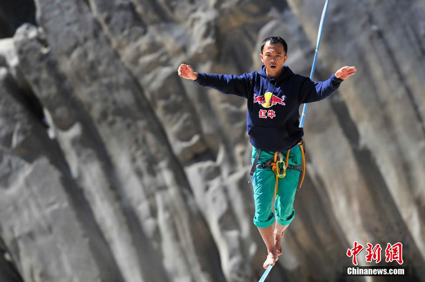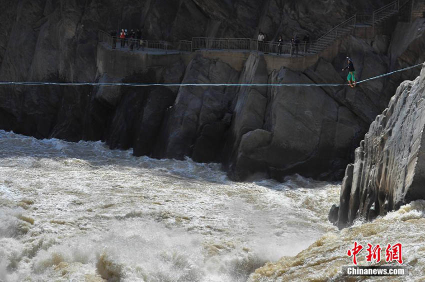 中國の綱渡り選手である張亮選手(31)が4月26日、雲(yún)南省シャングリラ市の金沙江で最もスリリングな虎跳峽の通過に成功した。川面から16メートルの高さにある幅2センチ5ミリの綱の上を5分58秒かけて60メートルの金沙江を渡り切った。綱渡りはワイヤースポーツを基に発展したバランススポーツで、バランスバーなどの補助具を使わずにバランスを保つ。張選手は現(xiàn)在、中國における高度と長さの綱渡り記録保持者である。中國新聞網(wǎng)が伝えた。(編集JK)