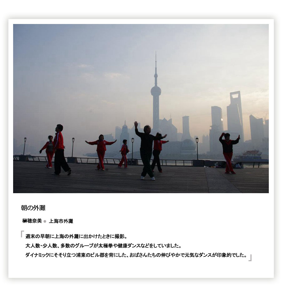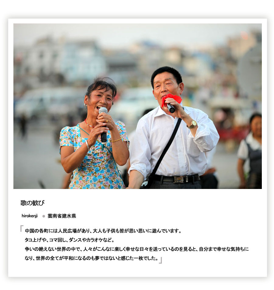 今回の訪中日本人観光客寫真コンテストではたくさんの「中國の日?!工蛞姢膜堡毪长趣扦毪坤恧?。彼らが撮影したのはもしかしたら中國人の日常生活を代表するものではないかもしれず、また一観光客から見た中國に過ぎないかも知れない。しかし作品からは生活の溫もりと真の美しさを感じることができるだろう。(編集JK)