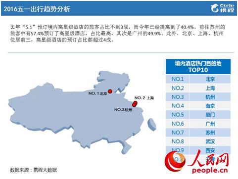 これ以外にも、宿泊施設に対する観光客の要求もますます厳しくなっている。昨年のメーデー連休中に星の數(shù)が多い高級ホテルを予約した人は全體の3割に屆かなかったが、今年は40.4%に達している。北京?上海?杭州各都市では、高級ホテルの予約は軒並み4割を上回った。海外の人気観光地トップ10では、高級(4つ星または5つ星)ホテルに予約した人の割合は平均73.5%と、前年同期比より15ポイント上昇した。(編集KM)