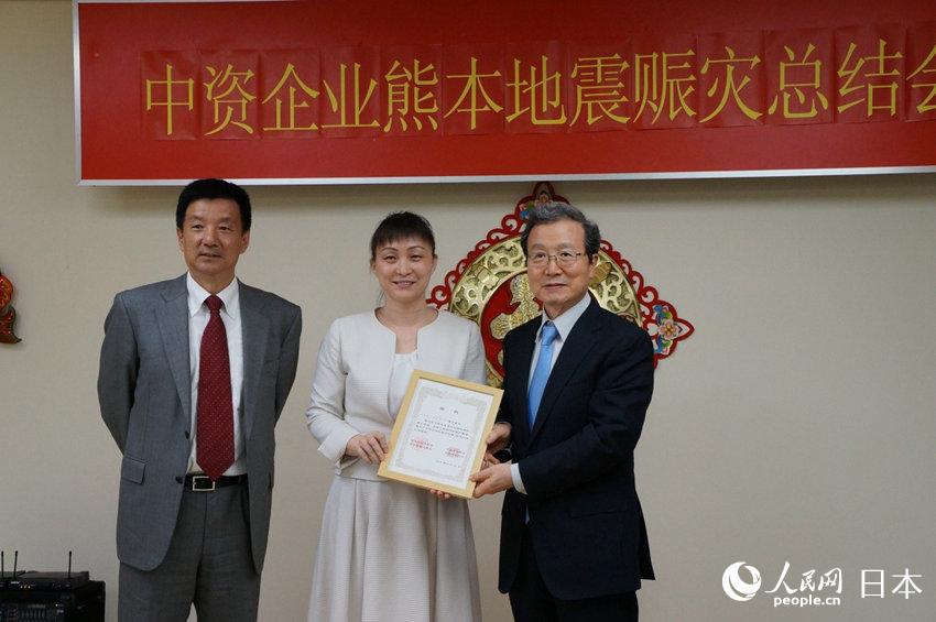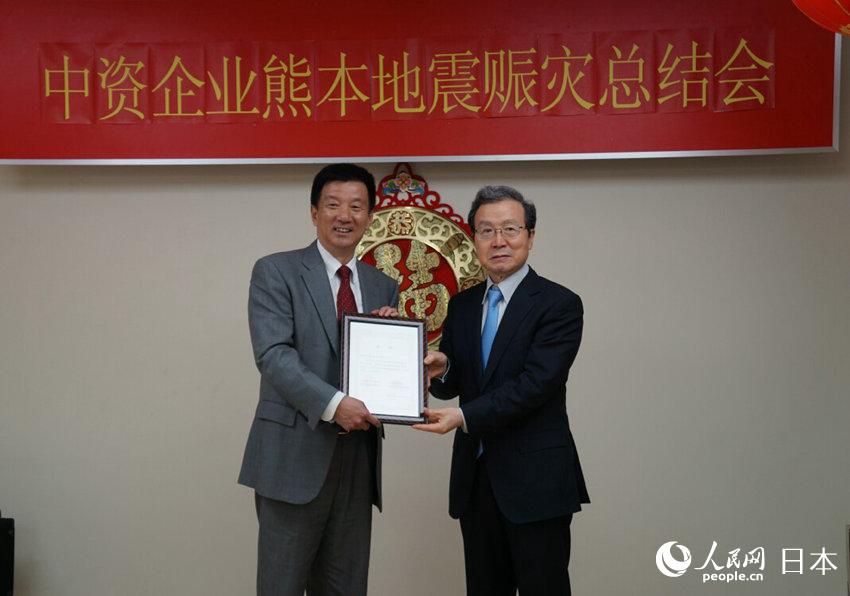 総括會(huì)で、程大使は寄付を行った中國系企業(yè)に賞狀を授與した。表彰を受けたのは、海信(日本)株式會(huì)社、中國農(nóng)業(yè)銀行東京支店、中國建設(shè)銀行東京支店、日本五金鉱産株式會(huì)社、在日中國企業(yè)協(xié)會(huì)、西日本中國企業(yè)連合會(huì)、日本中部中資企業(yè)協(xié)會(huì)など35の企業(yè)?協(xié)會(huì)。