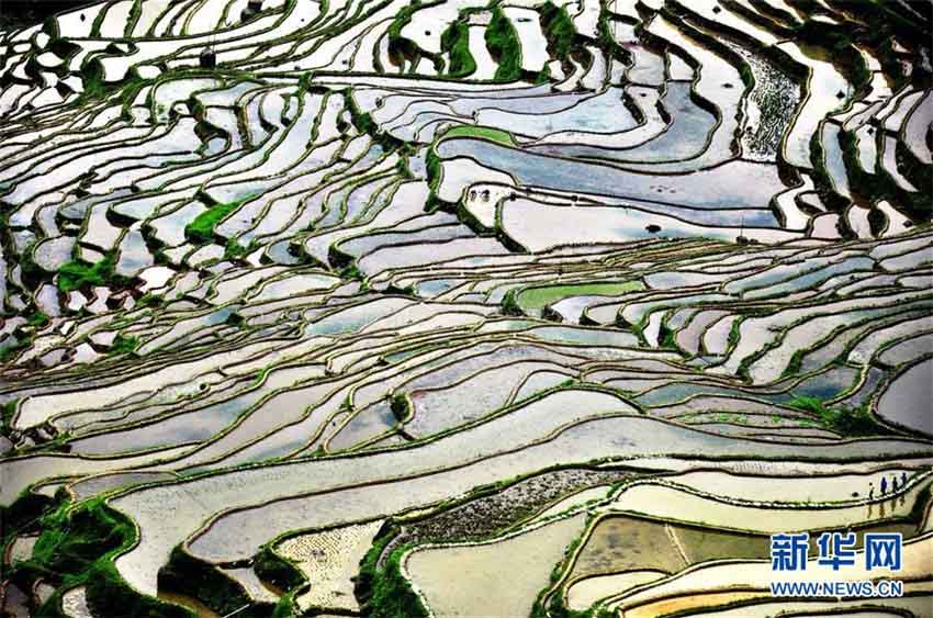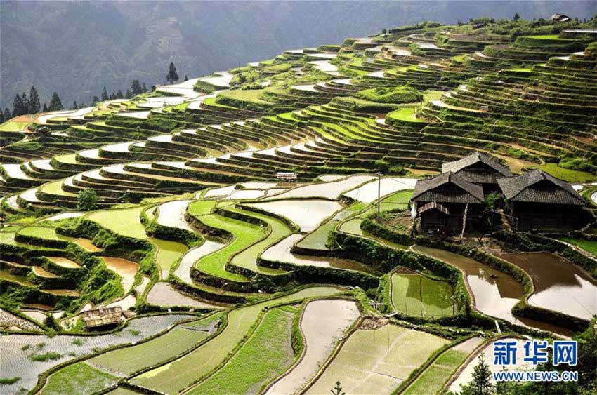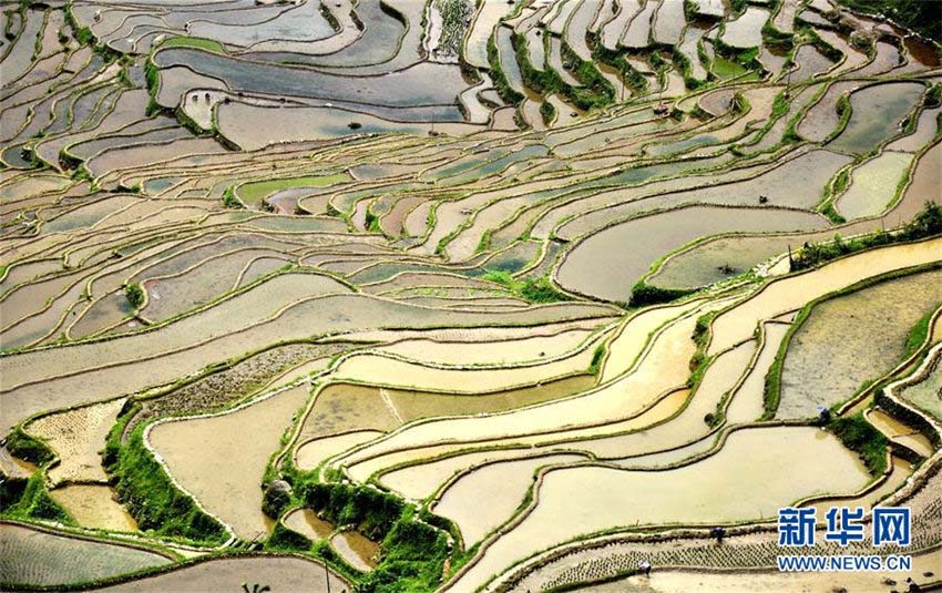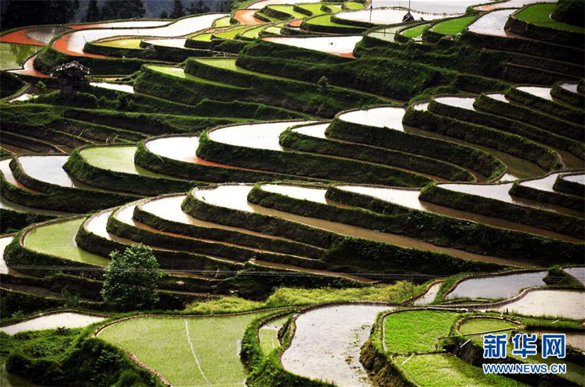 貴州省從江県山岳部は様々な形をした棚田が水をいっぱいに湛えており、細く続く田んぼのあぜが織りなす素晴らしい曲線は水墨畫のように限りなく美しい。寫真は5月2日、春の田植えを終えた貴州省從江県加榜の棚田の絶景を空撮したもの。新華網(wǎng)が伝えた。(編集JK)